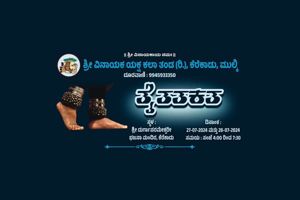 ಮುಲ್ಕಿ : ಶ್ರೀ ವಿನಾಯಕ ಯಕ್ಷ ಕಲಾ ತಂಡ (ರಿ.) ಕೆರೆಕಾಡು ಮುಲ್ಕಿ ಇದರ ವತಿಯಿಂದ ‘ತೈತತಕತ’ ಕಾರ್ಯಕ್ರಮವು ದಿನಾಂಕ 27-07-2024 ಮತ್ತು 28-07-2024ರಂದು ಸಂಜೆ ಗಂಟೆ 4-00ರಿಂದ ಕೆರೆಕಾಡು ಶ್ರೀ ದುರ್ಗಾಪರಮೇಶ್ವರೀ ಭಜನಾ ಮಂದಿರದಲ್ಲಿ ನಡೆಯಲಿದೆ.