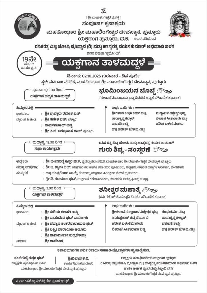 ಪುತ್ತೂರು : ಮಹತೋಭಾರ ಶ್ರೀ ಮಹಾಲಿಂಗೇಶ್ವರ ದೇವಸ್ಥಾನ ಪುತ್ತೂರು, ಯಕ್ಷರಂಗ ಪುತ್ತೂರು ಇವರ ವತಿಯಿಂದ ರಸಿಕರತ್ನ ವಿಟ್ಲ ಜೋಷಿ ಪ್ರತಿಷ್ಠಾನ (ರಿ.) ಮತ್ತು ಹಾಸ್ಯರತ್ನ ನಯನ ಕುಮಾರ್ ಅಭಿಮಾನಿ ಬಳಗ ಇವರ ಸಹಭಾಗಿತ್ವದೊಂದಿಗೆ ‘ಯಕ್ಷಗಾನ ತಾಳಮದ್ದಲೆ’ಯನ್ನು ದಿನಾಂಕ 02 ಅಕ್ಟೋಬರ್ 2025ರಂದು ಪುತ್ತೂರಿನ ಮಹತೋಭಾರ ಶ್ರೀ ಮಹಾಲಿಂಗೇಶ್ವರ ದೇವಸ್ಥಾನದ ನಟರಾಜ ವೇದಿಕೆಯಲ್ಲಿ ಹಮ್ಮಿಕೊಳ್ಳಲಾಗಿದೆ.