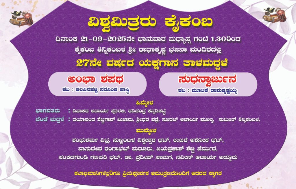 ಮಂಗಳೂರು : ವಿಶ್ವಮಿತ್ರರು ಕೈಕಂಬ ಇದರ 27ನೇ ವರ್ಷದ ಯಕ್ಷಗಾನ ತಾಳಮದ್ದಲೆ ಕಾರ್ಯಕ್ರಮವನ್ನು ದಿನಾಂಕ 21 ಸೆಪ್ಟೆಂಬರ್ 2025ರಂದು ಮಧ್ಯಾಹ್ನ 1-30 ಗಂಟೆಗೆ ಕೈಕಂಬ ಕಿನ್ನಿಕಂಬಳ ಶ್ರೀ ರಾಧಾಕೃಷ್ಣ ಭಜನಾ ಮಂದಿರದಲ್ಲಿ ಆಯೋಜಿಸಲಾಗಿದೆ.