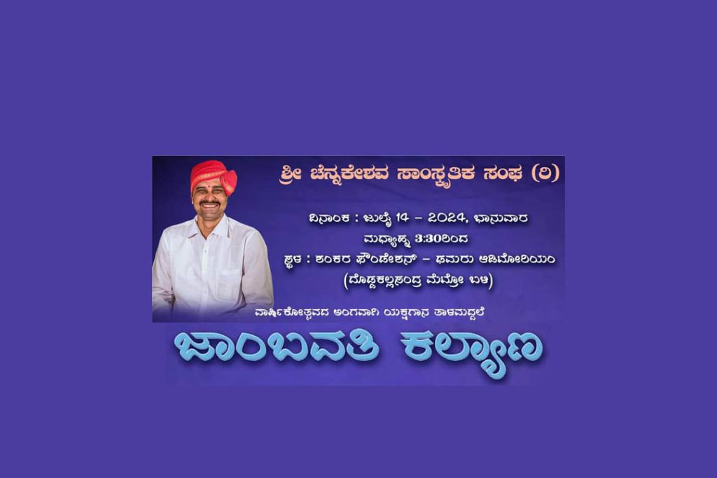 ಬೆಂಗಳೂರು : ಶ್ರೀ ಚೆನ್ನಕೇಶವ ಸಾಂಸ್ಕೃತಿಕ ಸಂಘ (ರಿ.) ಇದರ ವಾರ್ಷಿಕೋತ್ಸವದ ಅಂಗವಾಗಿ ‘ಜಾಂಬವತಿ ಕಲ್ಯಾಣ’ ಯಕ್ಷಗಾನ ತಾಳಮದ್ದಳೆಯು ದಿನಾಂಕ 14-07-2024ರಂದು ಮಧ್ಯಾಹ್ನ 3-30 ಗಂಟೆಗೆ ದೊಡ್ಡಕಲ್ಲಸಂದ್ರ ಮೆಟ್ರೊ ಬಳಿಯಿರುವ ಶಂಕರ ಫೌಂಡೇಷನ್ – ಢಮರು ಆಡಿಟೋರಿಯಂನಲ್ಲಿ ನಡೆಯಲಿದೆ. ಈ ಕಾರ್ಯಕ್ರಮಕ್ಕೆ ಉಚಿತ ಪ್ರವೇಶವಿದ್ದು ಹೆಚ್ಚಿನ ಮಾಹಿತಿಗಾಗಿ 7676330365ಗೆ ಕರೆ ಮಾಡಿ.