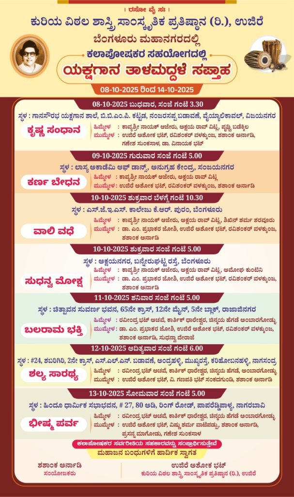 ಬೆಂಗಳೂರು : ಕುರಿಯ ವಿಠಲ ಶಾಸ್ತ್ರಿ ಸಾಂಸ್ಕೃತಿಕ ಪ್ರತಿಷ್ಠಾನ (ರಿ.) ಉಜಿರೆ ಇವರ ವತಿಯಿಂದ ಬೆಂಗಳೂರು ಮಹಾನಗರದಲ್ಲಿ ಕಲಾಪೋಷಕರ ಸಹಯೋಗದಲ್ಲಿ ‘ಯಕ್ಷಗಾನ ತಾಳಮದ್ದಳೆ ಸಪ್ತಾಹ’ವನ್ನು ದಿನಾಂಕ 08ರಿಂದ 14 ಅಕ್ಟೋಬರ್ 2025ರವೆರೆಗೆ ಹಮ್ಮಿಕೊಳ್ಳಲಾಗಿದೆ.