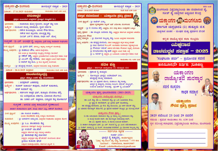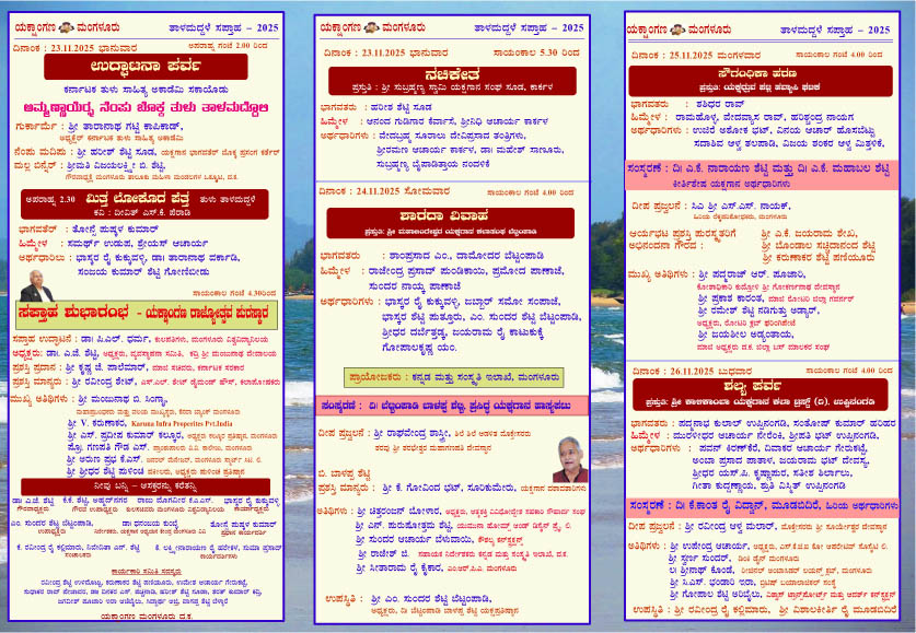 ಸರಣಿ ತಾಳಮದ್ದಳೆ : ದಿನಾಂಕ 23 ನವೆಂಬರ 2025ರಿಂದ ಕ್ರಮವಾಗಿ ಕರ್ನಾಟಕ ತುಳು ಸಾಹಿತ್ಯ ಅಕಾಡೆಮಿ ಸಹಯೋಗದಲ್ಲಿ ‘ಮಿತ್ತ ಲೋಕೆದ ಪೆತ್ತ’ ತುಳು ತಾಳಮದ್ದಳೆ ಮತ್ತು ಶ್ರೀ ಸುಬ್ರಹ್ಮಣ್ಯ ಸ್ವಾಮಿ ಯಕ್ಷಗಾನ- ಸಂಘ ಸೂಡ ಕಾರ್ಕಳ ಇವರಿಂದ ‘ನಚಿಕೇತ’, ಶ್ರೀ ಮಹಾಲಿಂಗೇಶ್ವರ ಯಕ್ಷಗಾನ ಕಲಾಸಂಘ ಬೆಟ್ಟಂಪಾಡಿ ಇವರಿಂದ ‘ಶಾರದಾ ವಿವಾಹ’, ಯಕ್ಷಧ್ರುವ ಪಟ್ಲ ಫೌಂಡೇಶನ್ ಹವ್ಯಾಸಿ ಘಟಕದಿಂದ ‘ಸೌಗಂಧಿಕಾ ಹರಣ’, ಶ್ರೀ ಕಾಳಿಕಾಂಬಾ ಯಕ್ಷಗಾನ ಕಲಾ ಟ್ರಸ್ಟ್ ಉಪ್ಪಿನಂಗಡಿ ಇವರಿಂದ ‘ಶಲ್ಯ ಪರ್ವ, ಅಂಬುರುಹ ಯಕ್ಷಸದನ ಪ್ರತಿಷ್ಠಾನ ಬೊಟ್ಟಿಕೆರೆ ಇವರಿಂದ ‘ವರುಣಾಧ್ವರ’, ಹವ್ಯಾಸಿ ಬಳಗ ಕದ್ರಿ ಮಂಗಳೂರು ಇವರಿಂದ ‘ಪಾಂಚಜನೋತ್ಪತ್ತಿ’, ಕರ್ನಾಟಕ ಯಕ್ಷಭಾರತಿ ಪುತ್ತೂರು ಇವರಿಂದ ‘ಸತೀ ಶಕ್ತಿ’ ಹೀಗೆ 7 ತಂಡಗಳು ಕನ್ನಡ ಭಾಷೆಯಲ್ಲಿ ವಿನೂತನ ಪ್ರಸಂಗಗಳನ್ನು ಪ್ರಸ್ತುತಪಡಿಸುತ್ತವೆ. ಈ ಎಲ್ಲಾ ತಂಡಗಳೊಂದಿಗೆ ಪ್ರತಿದಿನ ಜಿಲ್ಲೆಯ ಪ್ರಸಿದ್ಧ ಅತಿಥಿ ಕಲಾವಿದರು ಅರ್ಥಧಾರಿಗಳಾಗಿ ಭಾಗವಹಿಸಲಿದ್ದಾರೆ.