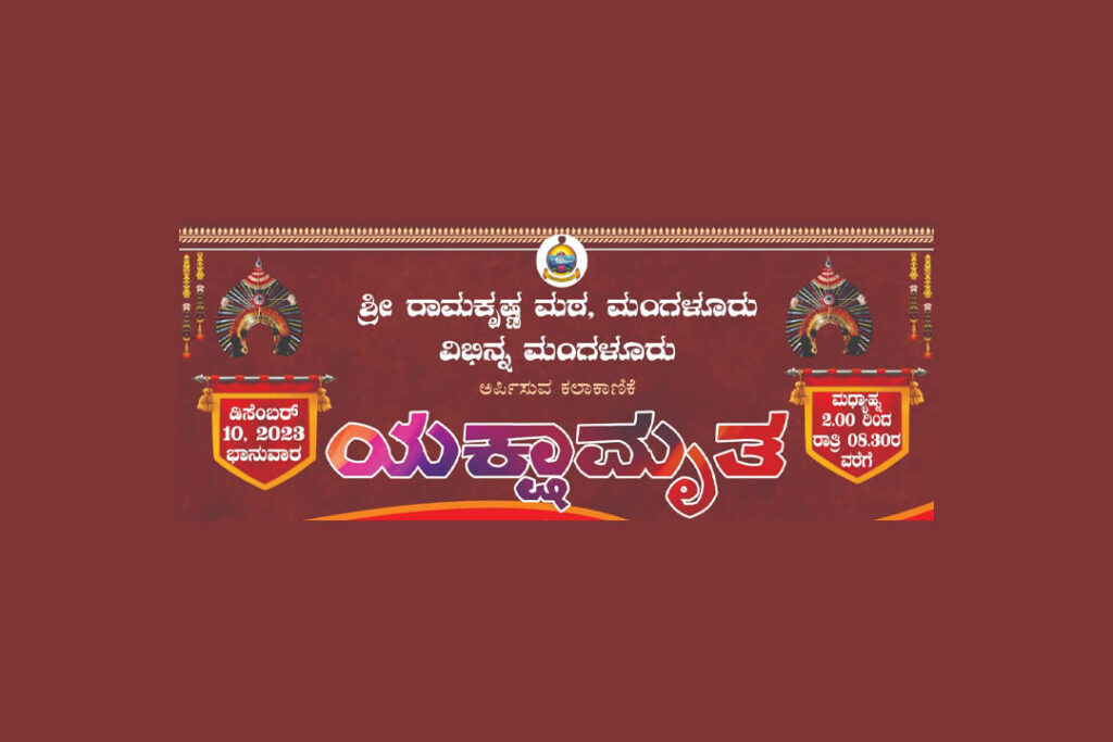 ಮಂಗಳೂರು : ಶ್ರೀ ರಾಮಕೃಷ್ಣ ಮಠ ಮಂಗಳೂರು ಮತ್ತು ವಿಭಿನ್ನ ಮಂಗಳೂರು ಅರ್ಪಿಸುವ ಕಲಾಕಾಣಿಕೆ ‘ಯಕ್ಷಾಮೃತ’ ದಿನಾಂಕ 10-12-2023 ರಂದು ಮಧ್ಯಾಹ್ನ 2 ಗಂಟೆಗೆ ಮಂಗಳೂರಿನ ಮಂಗಳಾದೇವಿಯ ಶ್ರೀ ರಾಮಕೃಷ್ಣ ಮಠದ ವಿವೇಕಾನಂದ ಸಭಾಂಗಣದಲ್ಲಿ ನಡೆಯಲಿದೆ. ಪೂರ್ಣಚಂದ್ರ ಯಕ್ಷಗಾನ ಮಂಡಳಿ (ರಿ.) ಕುಂಭಾಶಿ ಮತ್ತು ಅತಿಥಿ ಕಲಾವಿದರ ಕೂಡುವಿಕೆಯಲ್ಲಿ ‘ರಾಜಾ ಭದ್ರಸೇನ – ಶ್ರೀ ರಾಮನಿರ್ಯಾಣ’ ಎಂಬ ಕಥಾ ಭಾಗವನ್ನು ಆಡಿತೋರಿಸಲಿರುವರು.