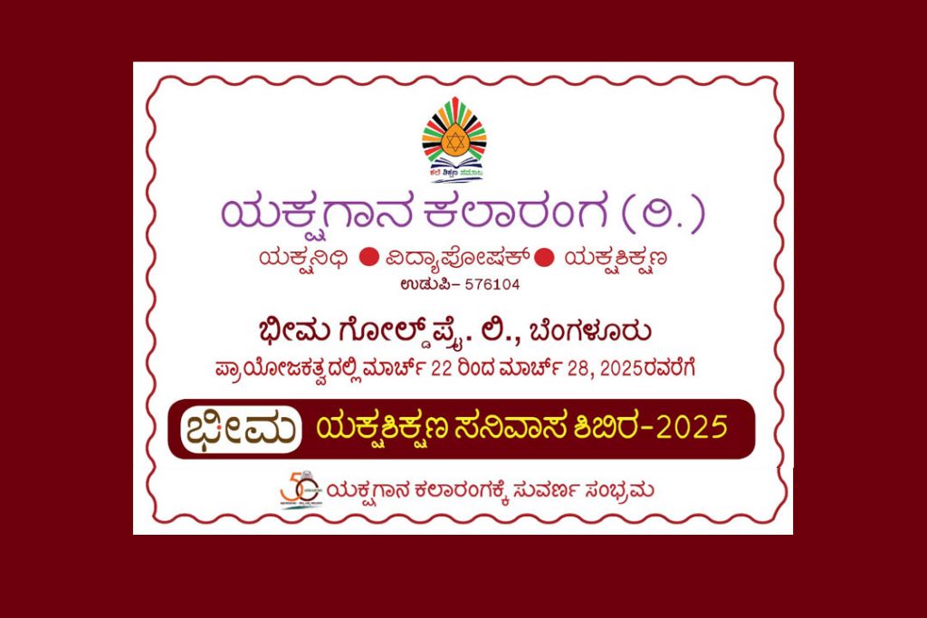 ಉಡುಪಿ : ಯಕ್ಷಗಾನ ಕಲಾರಂಗ (ರಿ.) ಇದರ ವತಿಯಿಂದ ಭೀಮ ಗೋಲ್ಡ್ ಪ್ರೈ.ಲಿ. ಬೆಂಗಳೂರು ಇದರ ಪ್ರಾಯೋಜಕತ್ವದಲ್ಲಿ ಭೀಮ ‘ಯಕ್ಷಶಿಕ್ಷಣ ಸನಿವಾಸ ಶಿಬಿರ -2025’ವನ್ನು ದಿನಾಂಕ 22 ಮಾರ್ಚ್ 2025ರಿಂದ 28 ಮಾರ್ಚ್ 2025ರವರೆಗೆ ಉಡುಪಿಯ ಕಲಾರಂಗ ಐ.ವೈ.ಸಿ. ಸಭಾಂಗಣದಲ್ಲಿ ಆಯೋಜಿಸಲಾಗಿದೆ.